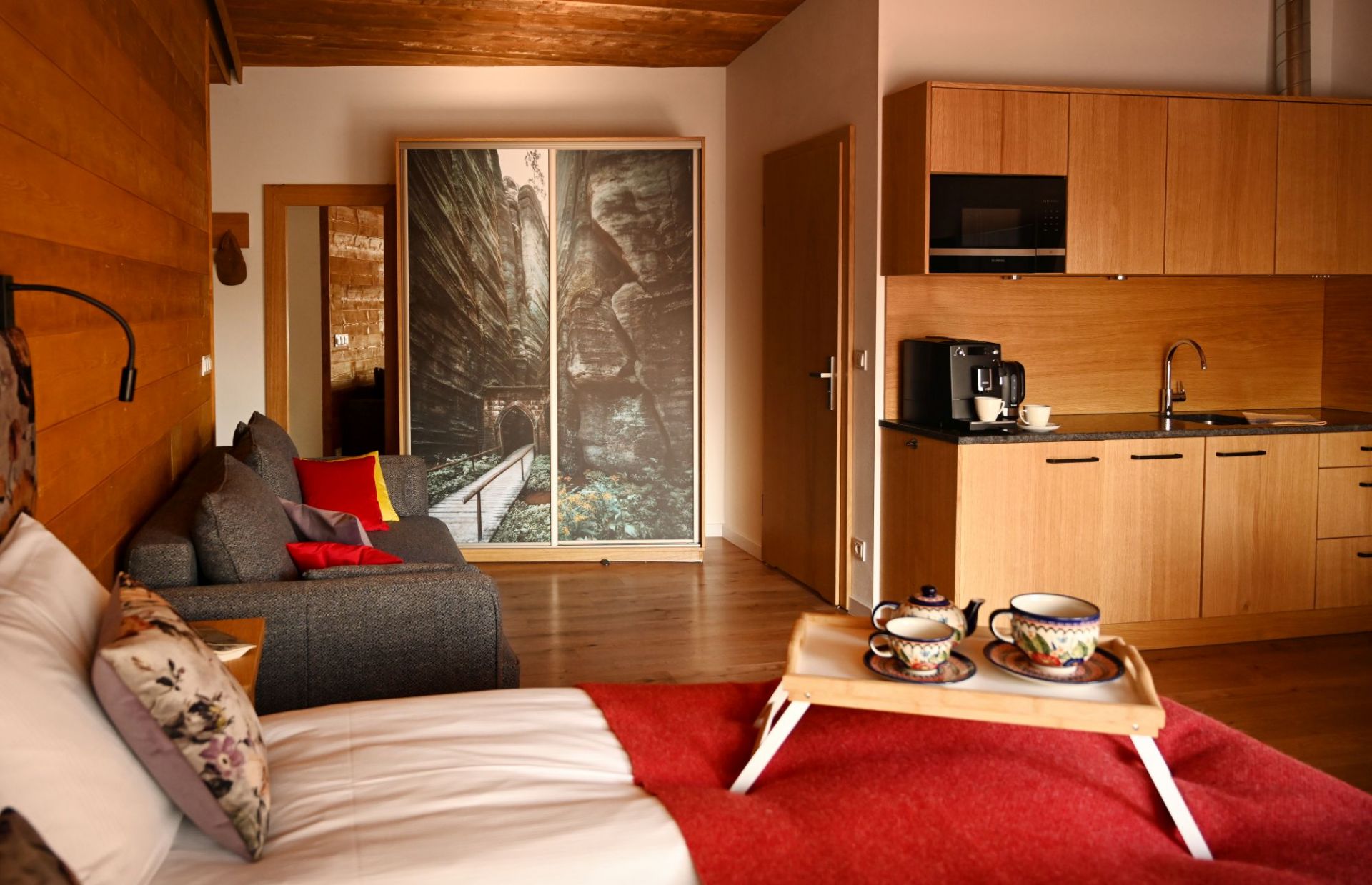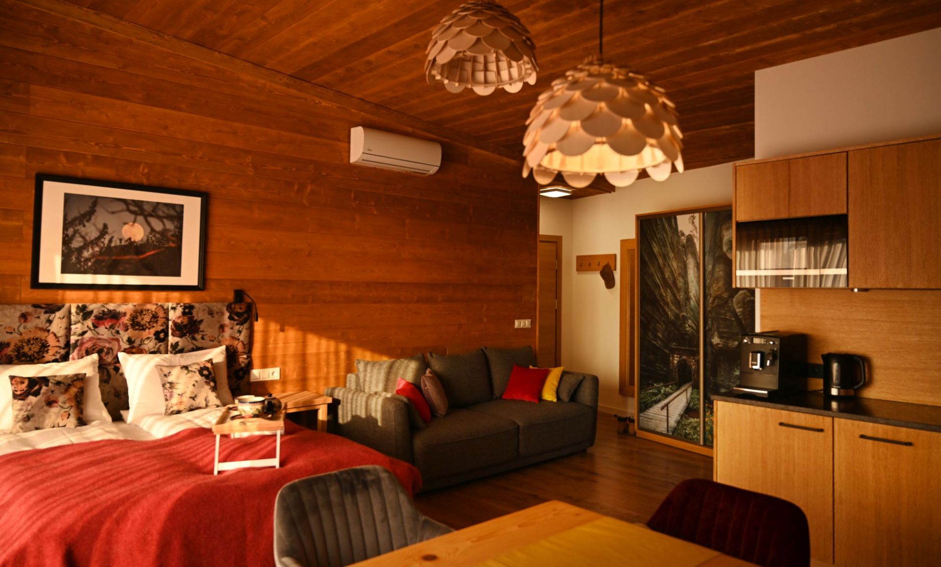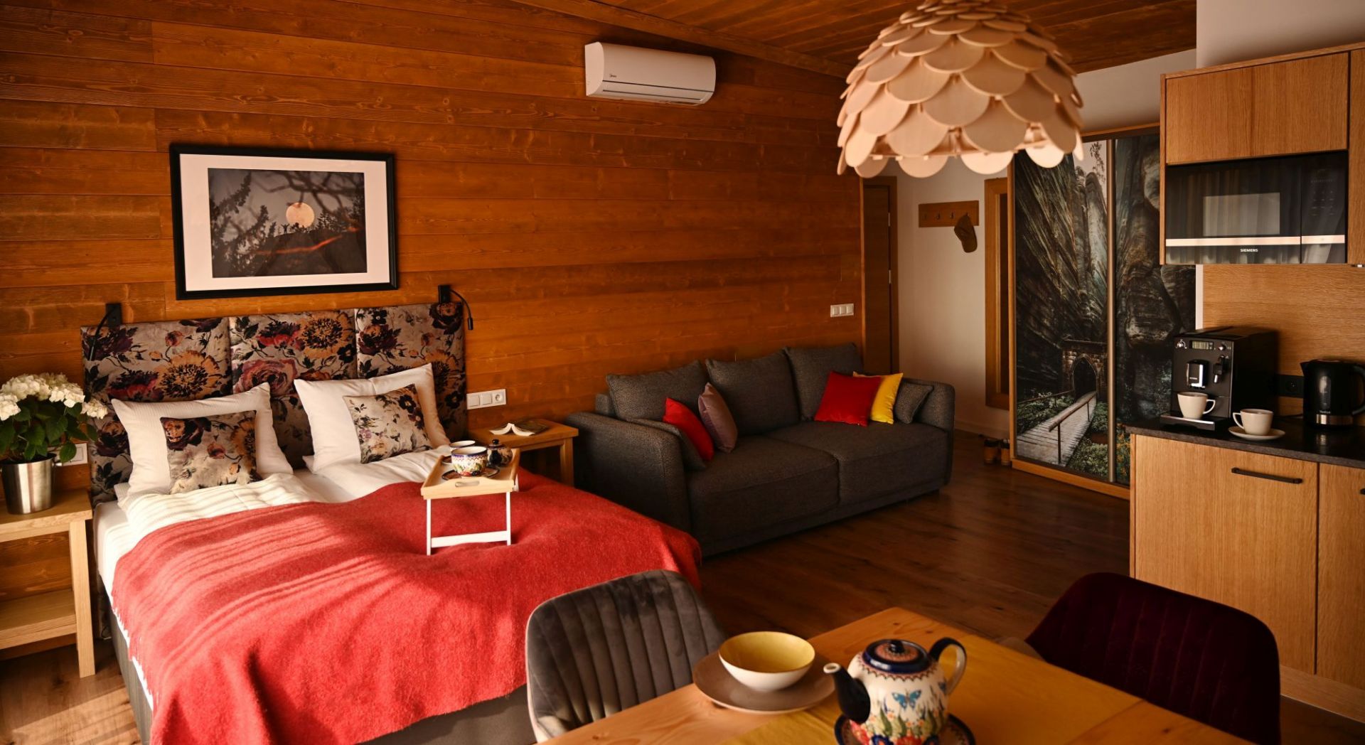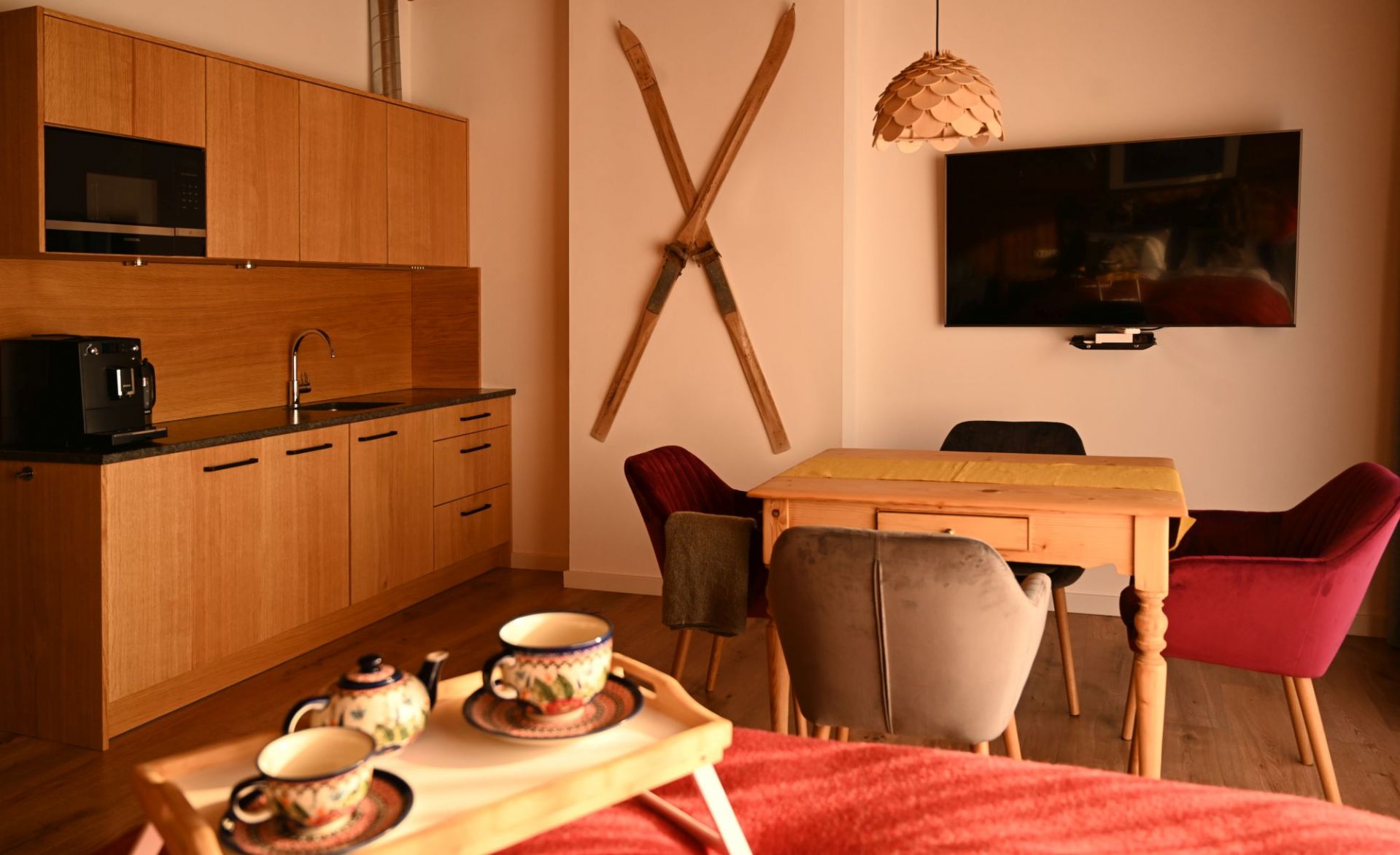 Komfortowe studio o powierzchni 32 m2 z łóżkiem małżeńskim, aneksem kuchennym, kącikiem wypoczynkowym z wygodną rozkładaną sofą oraz stołem z krzesłami. Idealny wybór dla max. 4.