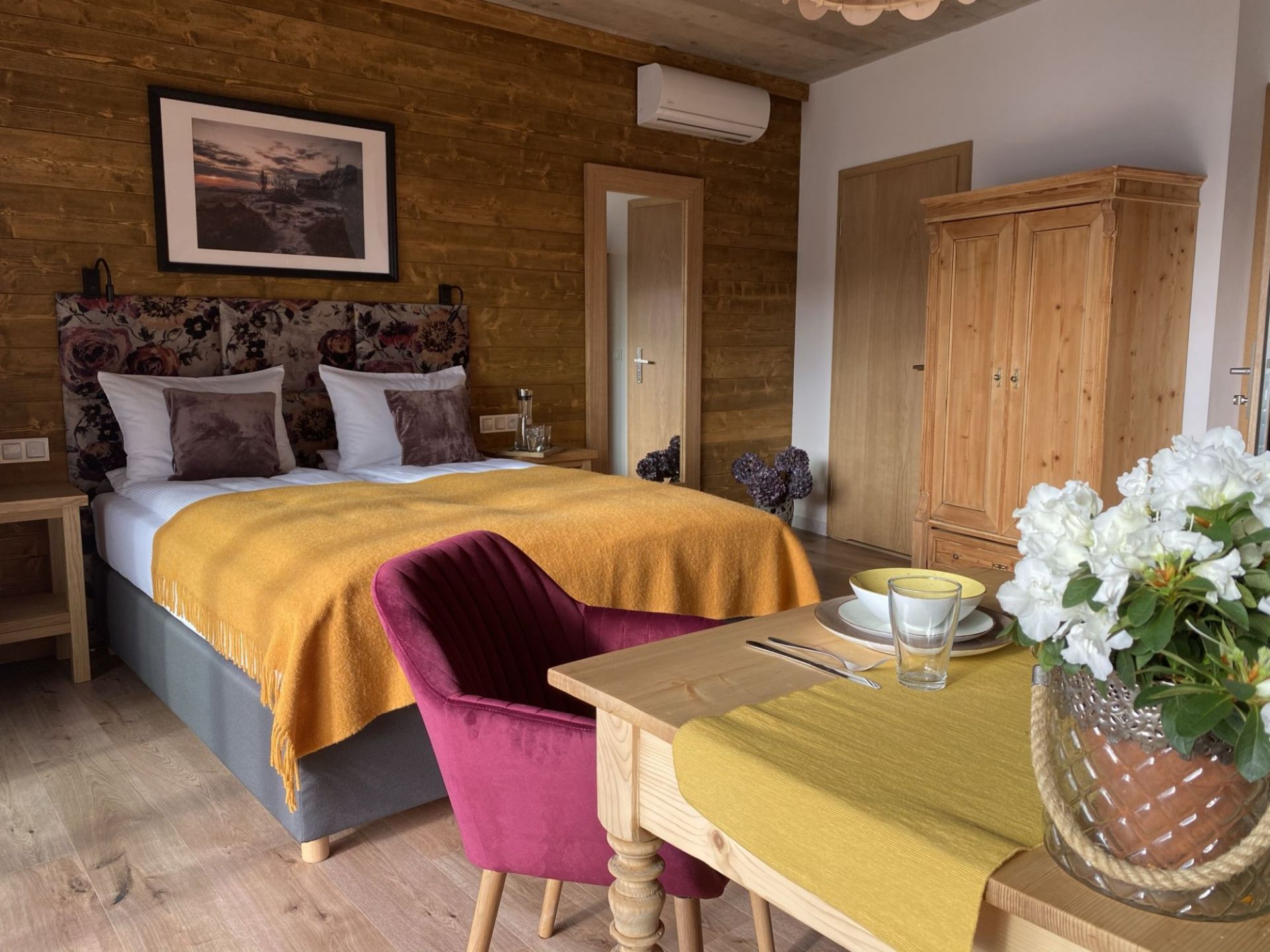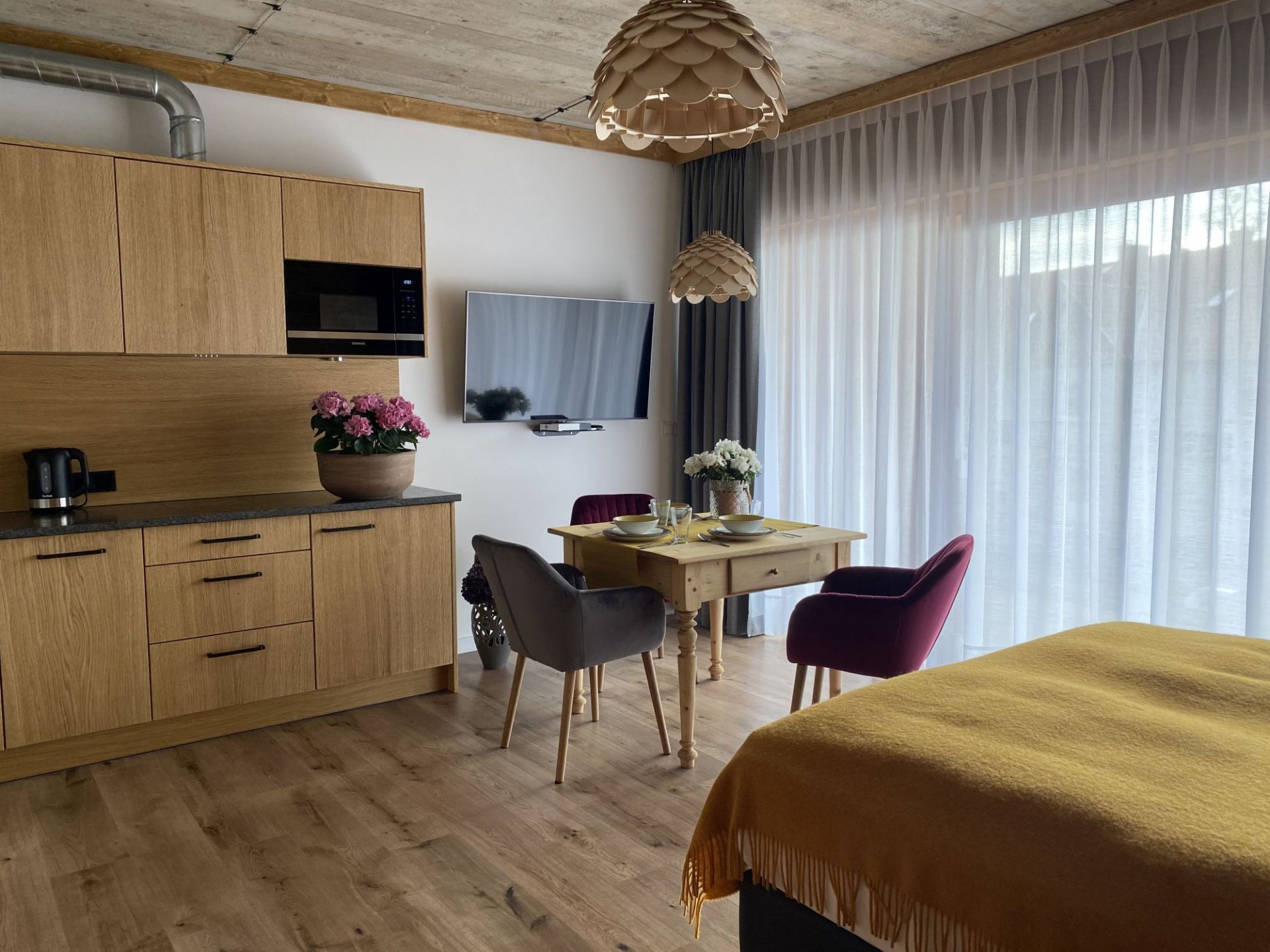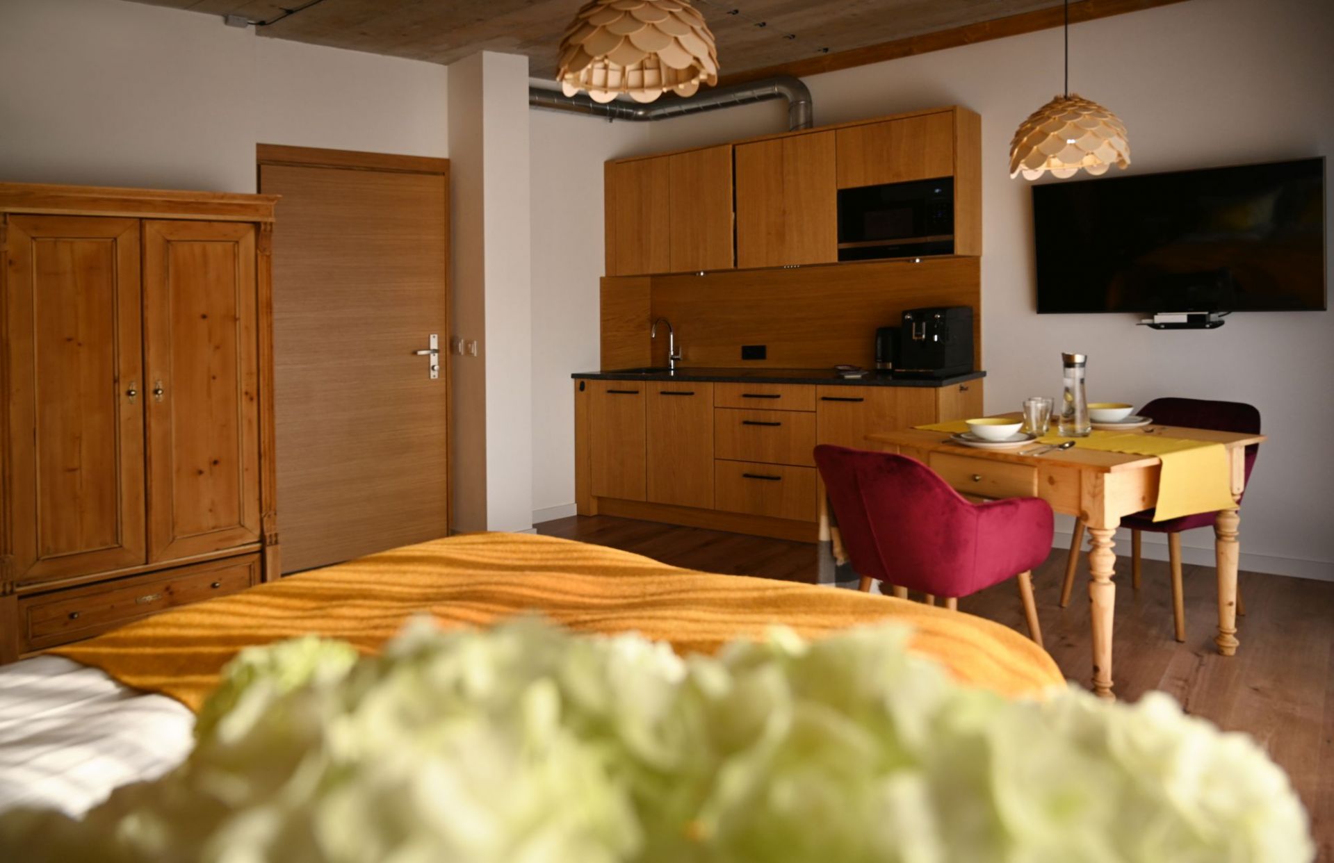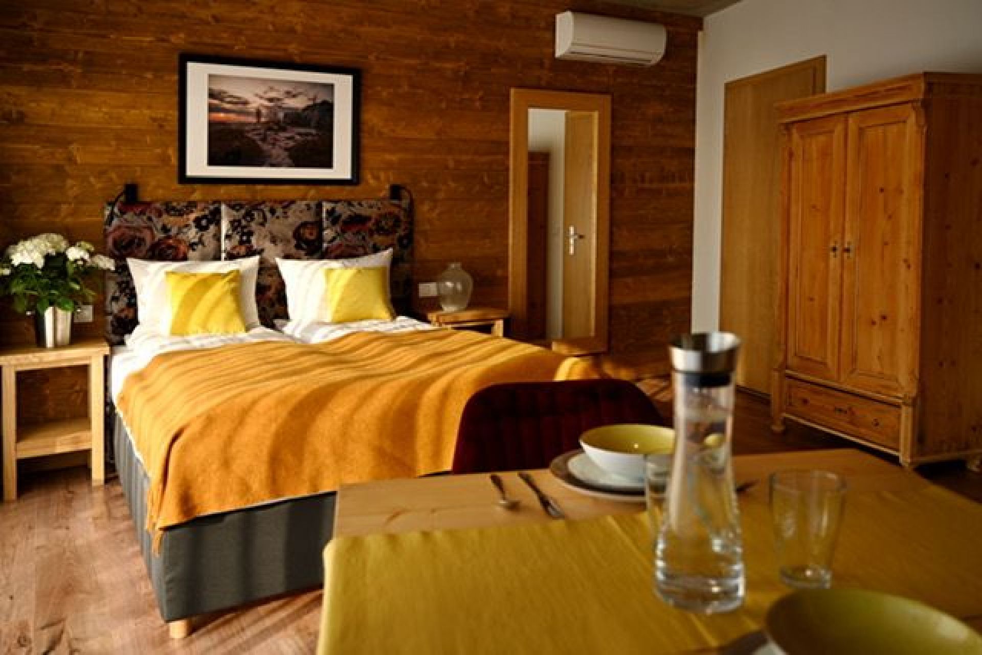 Przytulne studio o powierzchni 25 m2 z łóżkiem małżeńskim, aneksem kuchennym oraz stołem i krzesłami. Możliwość jednej dostawki. Idealny wybór dla pary.