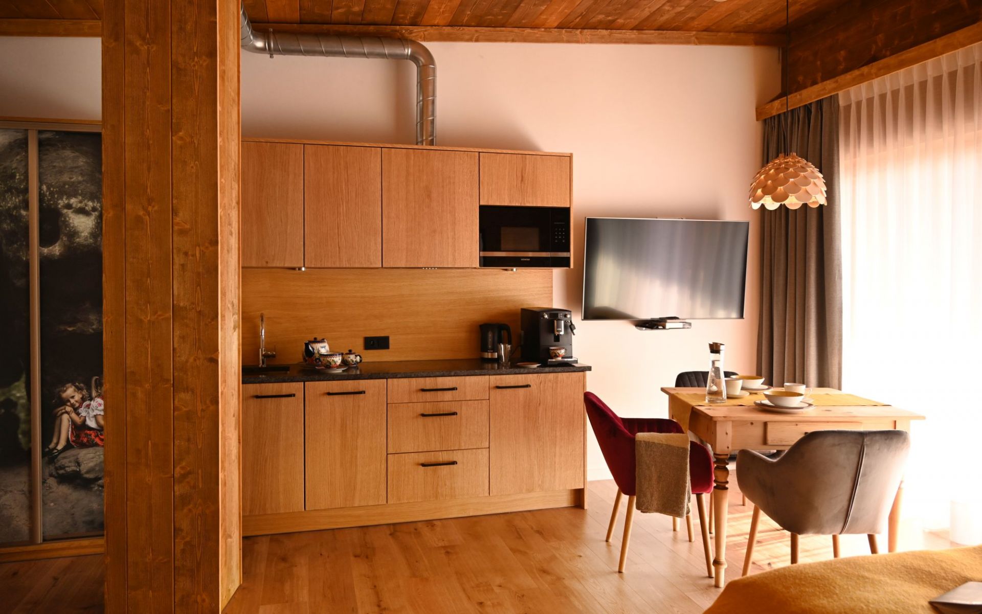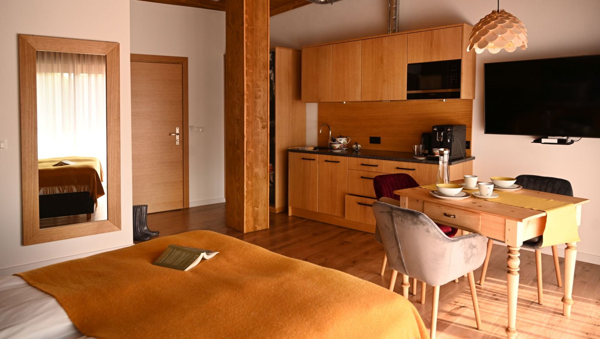 Przytulne studio o powierzchni 29 m2 z łóżkiem małżeńskim, aneksem kuchennym oraz stołem i krzesłami. Możliwość jednej dostawki. Idealny wybór dla pary.